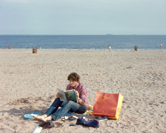 at Coney Island, New York. He is seen reading a popular magazine, which he only bought for the articles!